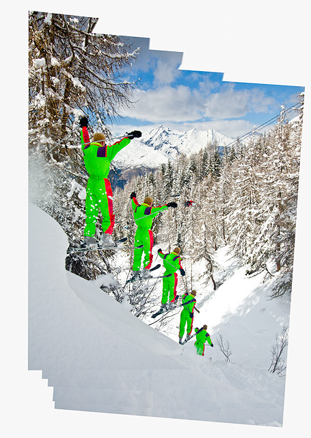 Я сделал только один из них, его можно было снять на штативе, но местоположение не позволяло! Я загрузил изображения в Photoshop, автоматически выровнял и затем вручную замаскировал области перекрытия, это было довольно легко, так как рамки находятся на правильном расстоянии друг от друга, чтобы минимизировать перекрытие. Небольшое наложение добавляет к эффекту, слишком много может затруднить понимание того, что происходит.
